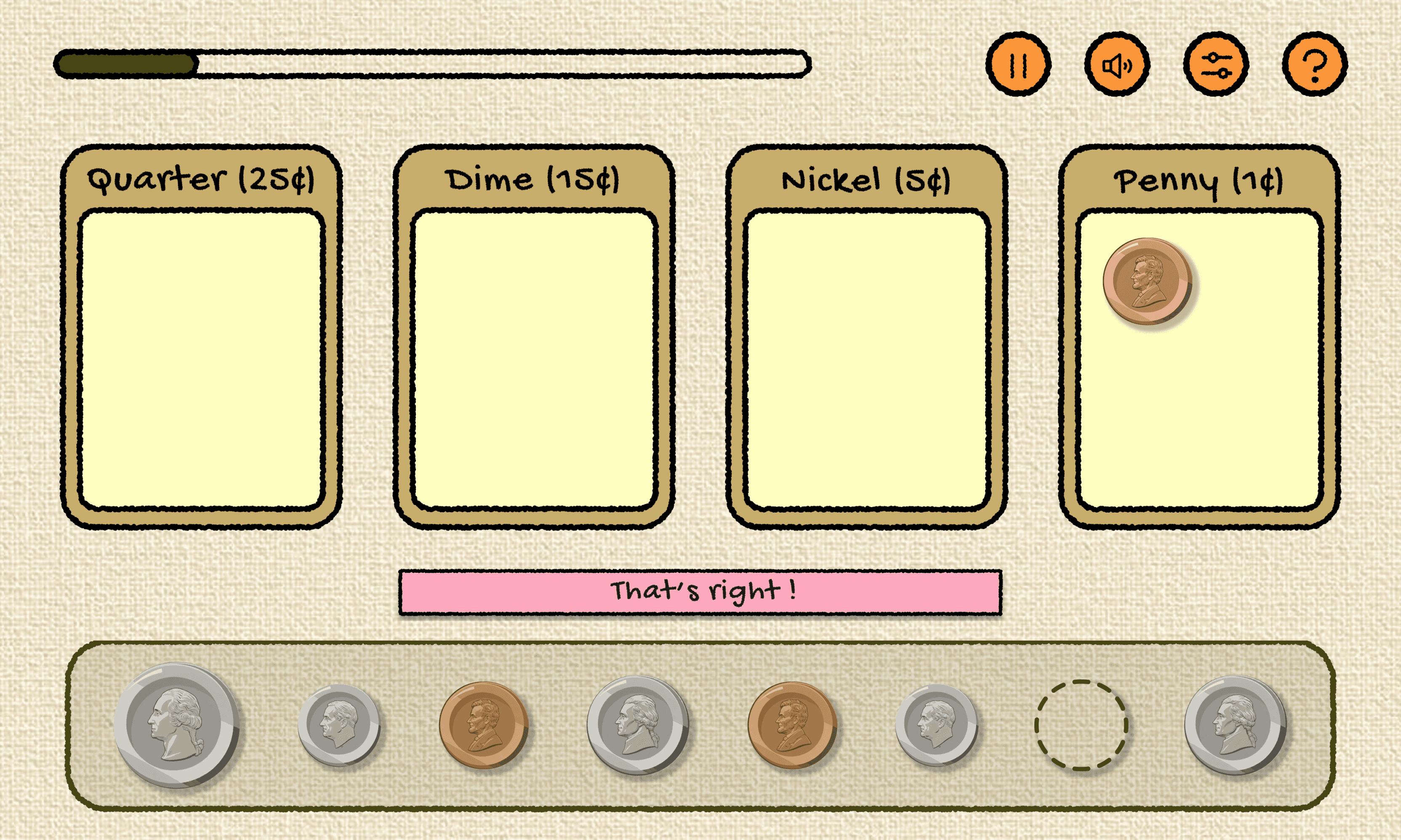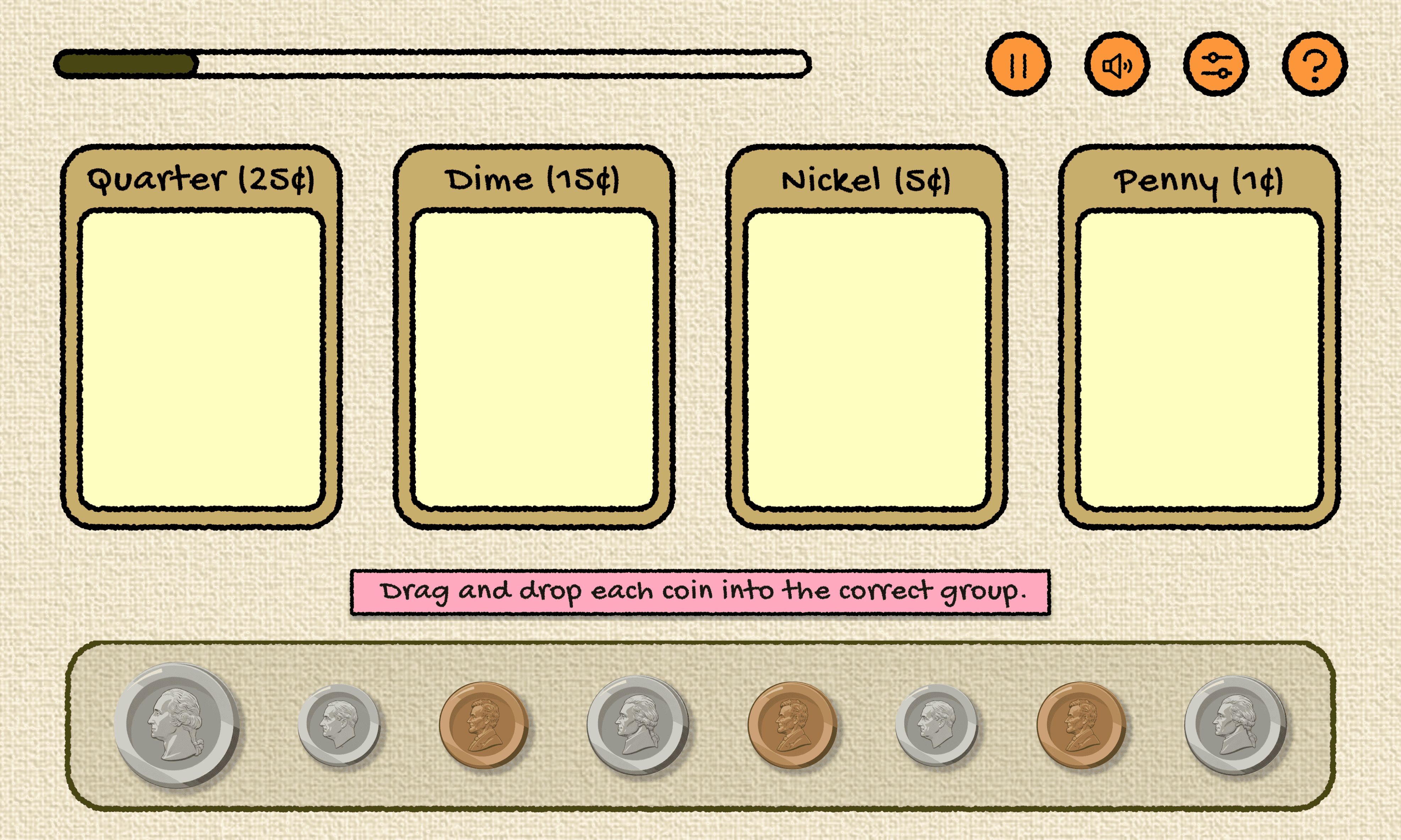 Students drag coins into matching bins to learn categorization before counting.